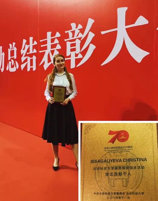 秋娜(Christina Issagaliyeva)在70年庆祝活动中获得了“突出贡献个人”的表彰,她来自哈萨克斯坦,这里是习主席提出“一带一路”倡议构想的国度,这也让秋娜对于“一带一路”有了更深的思考。她目前在北京学习工业设计专业,计划未来能把从“世界第一工业制造大国”中国学到的工业设计理念带回祖国,搭上“一带一路”发展的快车,为共建“人类命运共同体”贡献女性力量。
