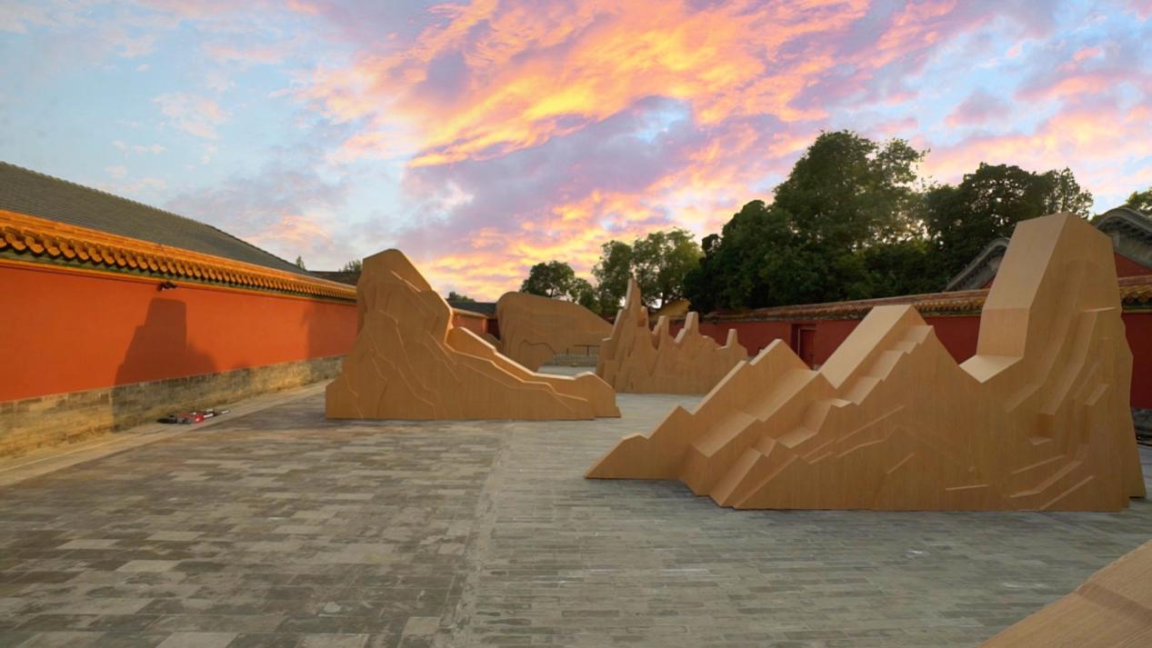 九座“大山”将开阔的空间围格成宽窄不一的行进空间,形成展览空间中蜿蜒的“道路”,模拟出传统中式山水园林的氛围,与故宫的红墙黄瓦相映成辉,让参观者在“山间”折返前行、移步换景。观者一步一景折返前行的探索,如同真的在怪石嶙峋的群山之间散步,千姿百态的景色自然浮现眼前,可谓“人在画中游”。