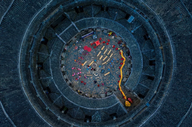 透过镜头,我们可以俯看富于客家传统色彩的圆形土楼,感受东方建筑之美的独一无二。